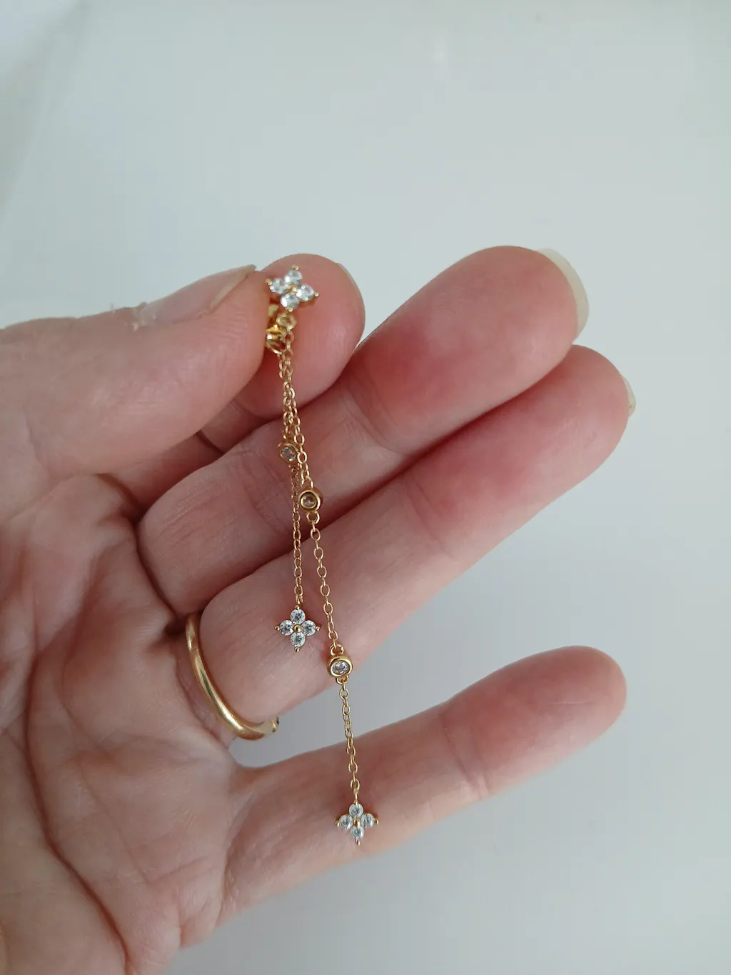 Elegant threader earring in 925 Sterling Silver, gilded with 24k gold, adorned with delicate stones for a lightweight effect.