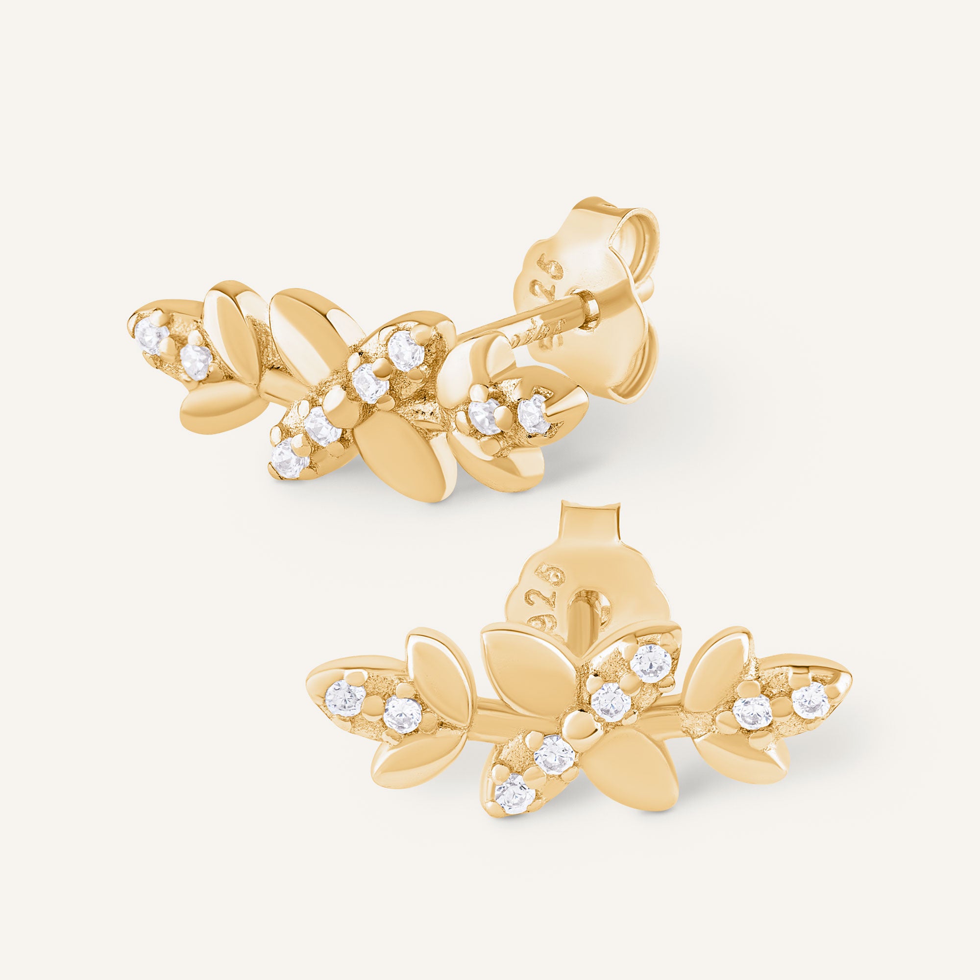 Boucle puce en argent 925 doré à l'Or fin 24 carats, dessinée en arc et sertie de pierres de zirconium qui captent la lumière avec élégance.